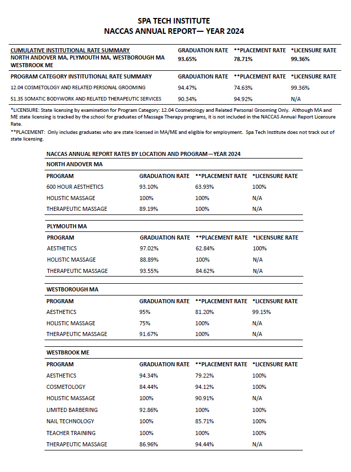 Gainful Employment Disclosures – Early Implementation On July 1, 2019, the U.S. Department of Education (“Department”) published final regulations in the Federal Register rescinding the 2014 gainful employment regulations at 34 CFR part 668 subpart Q and subpart R. Spa Tech Institute’s decision to participate in early implementation of the rescission granted by the Secretary of Education is on file in the school Compliance Department.